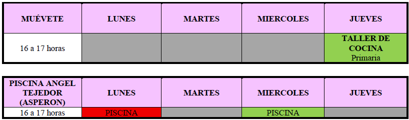 El resto de actividades ofertadas serán desarrolladas por las empresas Muévete y Rescata2, tal y como se indica en el cuadro adjunto. Para la realización del Taller de cocina serán los monitores los que acerquen a los alumnos a las instalaciones de la empresa Muévete.